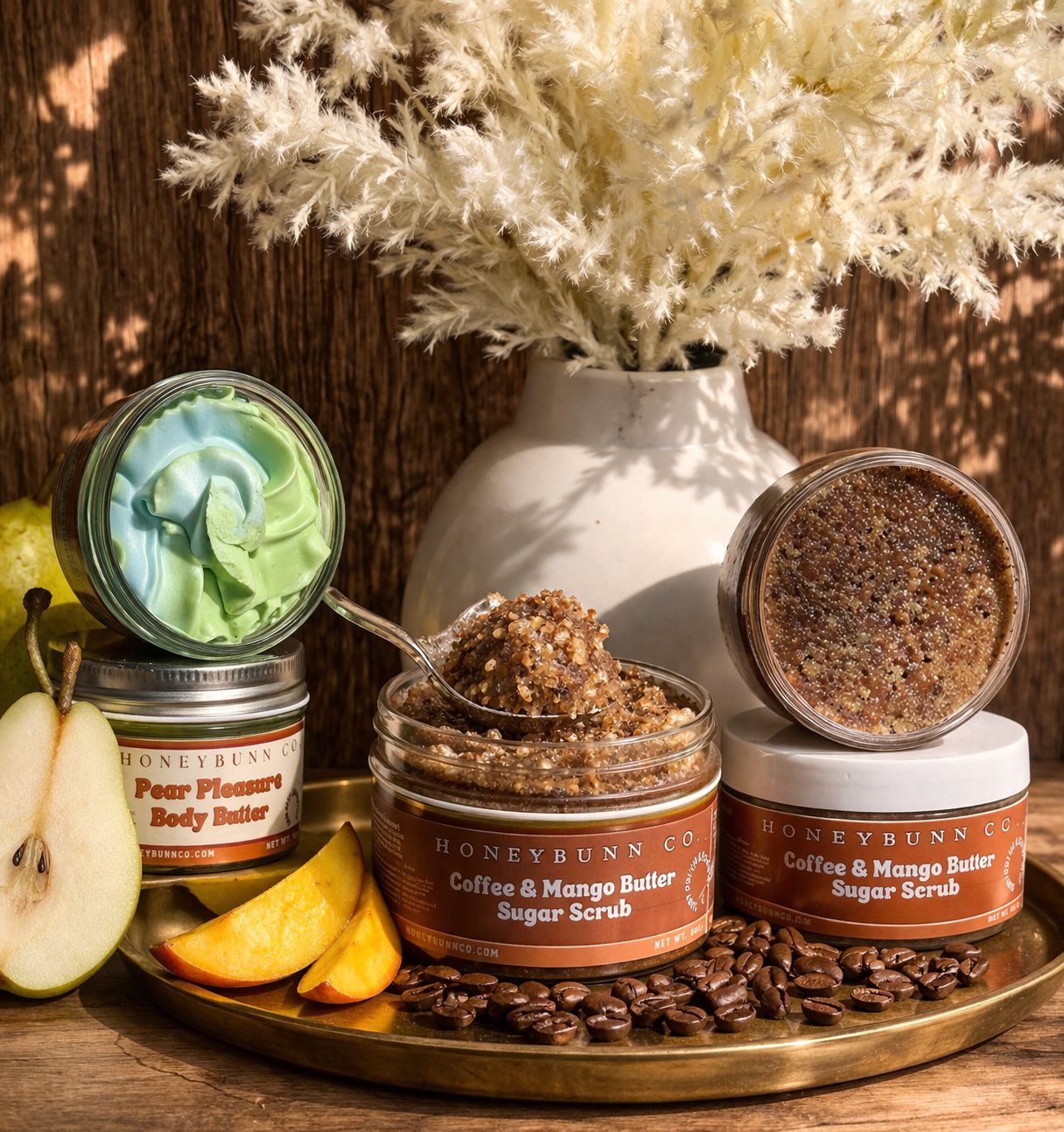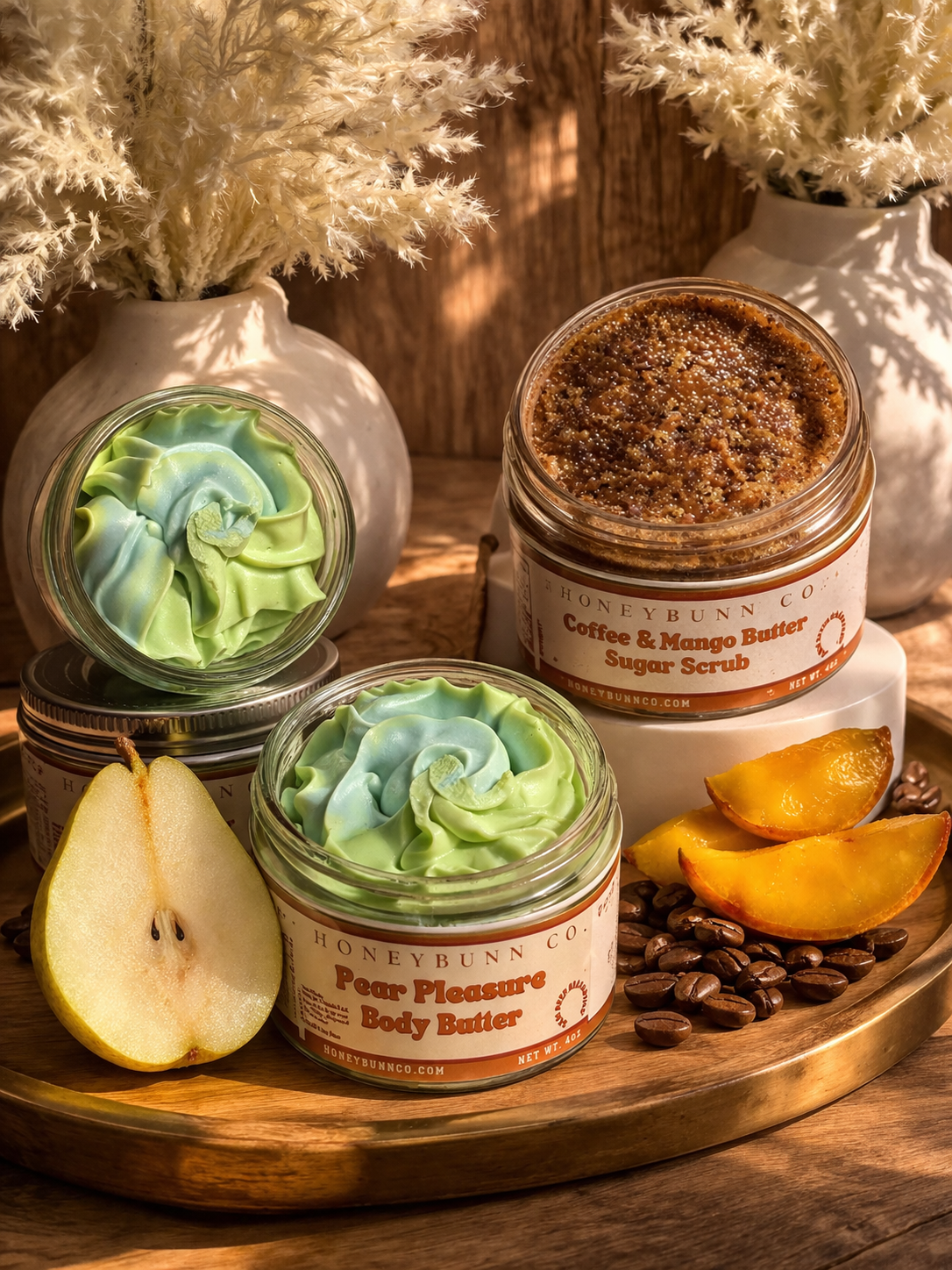 Indulge your skin with the perfect balance of freshness and warmth in our Pear Scented Body Butter & Coffee Scrub Set.