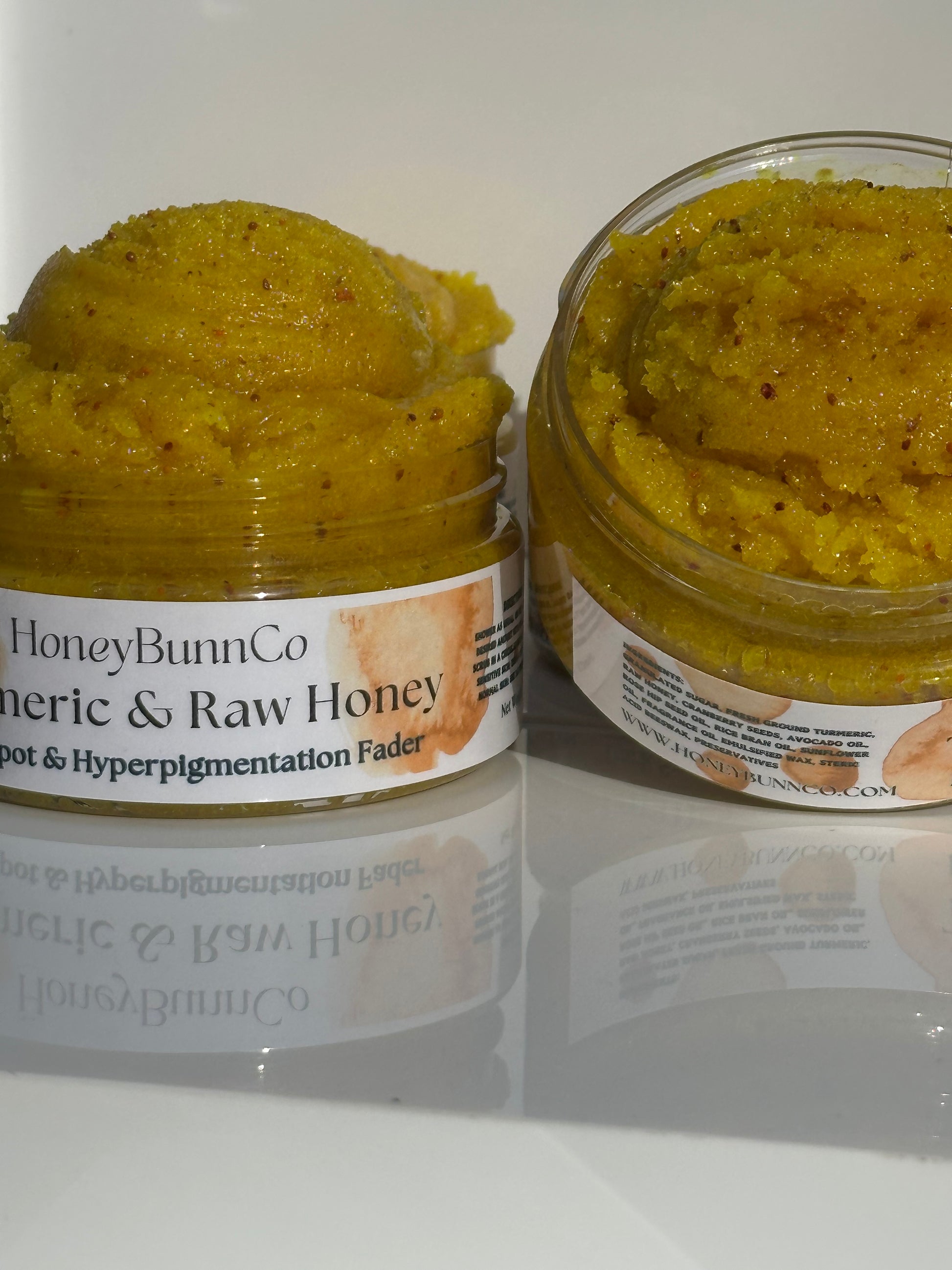 granulated sugar, olive oil, coconut oil, grape seed oil, sunflower oil, rice bran oil, freshly ground turmeric, raw honey, beeswax, steric acid, emulsifying wax, fragrance oil and optiphen preservative